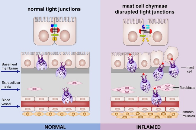 慢性哮喘的主要特征是上皮屏障功能失調和氣道壁損傷,氣道上皮細胞的脫落是哮喘氣道炎癥的后果之一,其病理機制不甚清楚。周曉鷹教授研究團隊用氣道組織原位模型、計算機圖像分析技術和免疫熒光技術,為闡明新的分子機制提供了證據(jù)。該研究發(fā)現(xiàn):在炎癥條件下,激活的肥大細胞專屬性類糜蛋白酶通過降解氣道上皮細胞膜上的緊密接合部蛋白分子群(上皮型鈣黏附蛋白,閉合蛋白,閉鎖蛋白-4,緊密連接蛋白-1),損傷氣道上皮組織中細胞與細胞、細胞與基底膜之間結合的完整性并影響信息傳導;肥大細胞類糜蛋白酶下調細胞內(nèi)的結構蛋白-細胞角蛋白和局部粘著斑激酶的表達以減弱細胞粘附能力,并激活細胞外的基質金屬蛋白酶-2的前體以誘導基底膜基質重塑而抑制創(chuàng)面愈合,導致哮喘氣道上皮脫落,進而引起上皮屏障功能失調和氣道壁損傷。