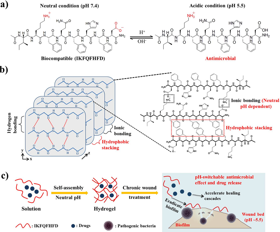 本工作在前期研究的基礎(chǔ)上,設(shè)計(jì)了一種具有酸性pH激活的廣譜抗菌八肽(IKFQFHFD)。此多肽在中性pH條件下具有良好的生物相容性,并能通過(guò)自組裝形成超分子水凝膠載藥體系。體外實(shí)驗(yàn)表明,此水凝膠載藥體系在傷口感染微環(huán)境條件下(酸性pH)能夠發(fā)生解聚,從而同時(shí)實(shí)現(xiàn)了生物膜的殺傷和傷口愈合藥物的原位釋放。另外,動(dòng)物實(shí)驗(yàn)結(jié)果表明,此水凝膠體系能夠在20天內(nèi)成功實(shí)現(xiàn)糖尿病小鼠耐藥細(xì)菌生物膜感染傷口的完全愈合,顯示出了作為慢性傷口敷料的巨大應(yīng)用潛力。