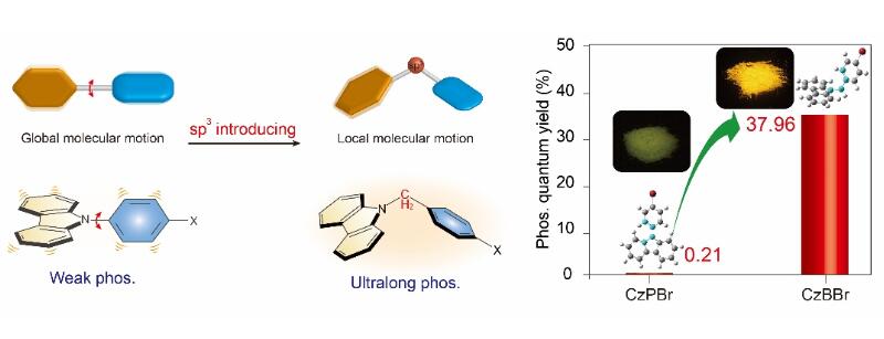 近日,我校材料科學(xué)與工程學(xué)院朱衛(wèi)國教授團(tuán)隊(duì)和南京工業(yè)大學(xué)安眾福教授團(tuán)隊(duì)合作,巧妙利用sp3雜化的亞甲基聯(lián)姻給體(D)和受體(A)單元,發(fā)展了一類新型D-C(sp3)-A型高效率超長有機(jī)RTP材料。這類貌似“四面體”的分子具有與眾不同的結(jié)構(gòu)特點(diǎn),其非共軛的亞甲基可有效“打斷”D-A單元之間的電子離域,阻礙激發(fā)態(tài)躍遷中的結(jié)構(gòu)變形,從而抑制分子的非輻射躍遷,實(shí)現(xiàn)高效率超長有機(jī)室溫磷光。單晶分析和理論計算發(fā)現(xiàn),晶體中分子間的π-Br相互作用可加速系間穿越(ISC)的過程,亞甲基的嵌入可使單線態(tài)激發(fā)態(tài)(S1)從整個分子的離域轉(zhuǎn)變?yōu)榫植窟沁虻碾x域,這意味著CzBBr激發(fā)態(tài)衰減過程中的結(jié)構(gòu)變形遠(yuǎn)小于CzPBr的結(jié)構(gòu)變形。最終CzBBr的磷光量子效率(ФPh)高達(dá)38%。這項(xiàng)研究開拓了高效率、長壽命RTP材料構(gòu)建的新路徑。