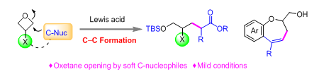 功地實現(xiàn)了氧雜環(huán)丁烷的碳開環(huán)反應(yīng)。此項工作避開了傳統(tǒng)的金屬試劑,在軟碳親核試劑方面取得了完全新穎的突破,反應(yīng)所構(gòu)建的產(chǎn)物4-羥基酯更是一類在全合成領(lǐng)域具有巨大應(yīng)用的分子骨架。通過巧妙的分子設(shè)計,同樣的策略成功地應(yīng)用到了分子內(nèi)碳開環(huán)反應(yīng)中,為天然產(chǎn)物骨架benzo[b]oxepine提供了全新的構(gòu)建策略。這項研究不僅是兩個著名的有機(jī)人名反應(yīng)Mukaiyama Aldol和Prins Reaction的延伸,也為氧雜環(huán)丁烷開環(huán)反應(yīng)提供了新的思路。