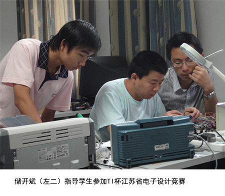 儲(chǔ)開斌深知學(xué)生實(shí)踐創(chuàng)新能力培養(yǎng)的重要性,他積極組織學(xué)生團(tuán)隊(duì)參與雙創(chuàng)大賽,并全身心投入其中。在2017年“挑戰(zhàn)杯”全國(guó)大學(xué)生課外學(xué)術(shù)作品競(jìng)賽中,為了進(jìn)行電路調(diào)試,儲(chǔ)開斌與學(xué)生一起熬夜備賽已成常態(tài)。當(dāng)學(xué)生遇到挫折時(shí),他及時(shí)關(guān)注學(xué)生狀態(tài),努力讓團(tuán)隊(duì)每一個(gè)學(xué)生在備賽中始終充滿激情。項(xiàng)目負(fù)責(zé)人劉玉喜只知埋頭苦干,不善言詞。作為指導(dǎo)老師,儲(chǔ)開斌經(jīng)常找他談心,為他提供項(xiàng)目新思路與方法,讓他在團(tuán)隊(duì)組員內(nèi)部不斷進(jìn)行答辯訓(xùn)練。在最后的國(guó)賽中,劉玉喜以優(yōu)秀的表達(dá)能力與邏輯思維能力贏得了現(xiàn)場(chǎng)評(píng)委的陣陣掌聲。在這一年,常州大學(xué)獲得“挑戰(zhàn)杯”全國(guó)大學(xué)生課外學(xué)術(shù)作品競(jìng)賽全國(guó)特等獎(jiǎng)。