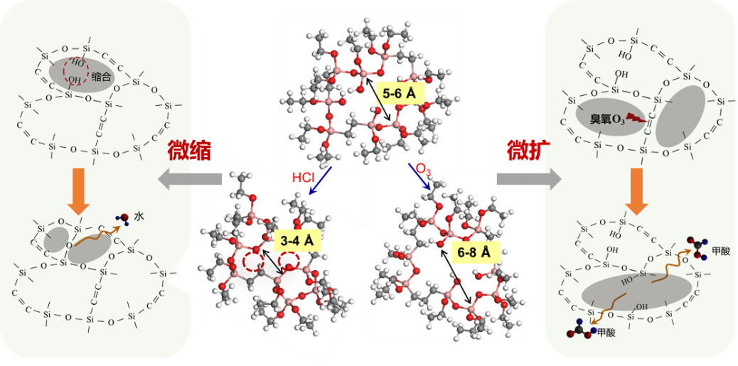基于雜化硅結(jié)構(gòu)中的羥基和橋聯(lián)基團(tuán)的反應(yīng)特性,研究團(tuán)隊(duì)發(fā)明了鹽酸蒸汽和臭氧水溶液孔道改性技術(shù),實(shí)現(xiàn)了膜有效孔徑的原位微縮和微擴(kuò)(圖2),顯著提高了溶劑回收和鹽水分離應(yīng)用中膜的選擇性和滲透通量。
