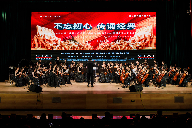 音樂會在《鋼鐵洪流》激昂的旋律中開場,將觀眾帶入了那個烽火連天的年代?!痘脑T兵》以緊湊節(jié)奏勾勒戰(zhàn)斗場景,仿佛重現(xiàn)騎兵沖鋒陷陣的颯爽英姿;《就是哪吒》傳遞無畏勇氣,正如抗戰(zhàn)中無數(shù)志士“明知山有虎,偏向虎山行” 的決絕;《Hand Clap》《鐵血丹心》《世界贈與我的》等曲目,或輕快或激昂,用音符訴說著各種情感;《海闊天空》巧妙地融合了經(jīng)典元素,大學(xué)生與小學(xué)生的完美配合,演繹出別樣的熱血激情;《G大調(diào)弦樂小夜曲》《第九交響曲》展現(xiàn)交響魅力,人們對和平與美好的憧憬在旋律中流淌;《金蛇狂舞》《燈火里的中國》融入多種樂器與演唱,洋溢著濃厚的家國情懷;最終章由我校汪嘯怡和黃靖博兩位老師演繹的《不忘初心》,凝聚了對歷史的深刻記憶與對未來的美好憧憬,全場觀眾沉浸在音樂營造的歷史氛圍中,重溫民族記憶,汲取前進(jìn)力量。