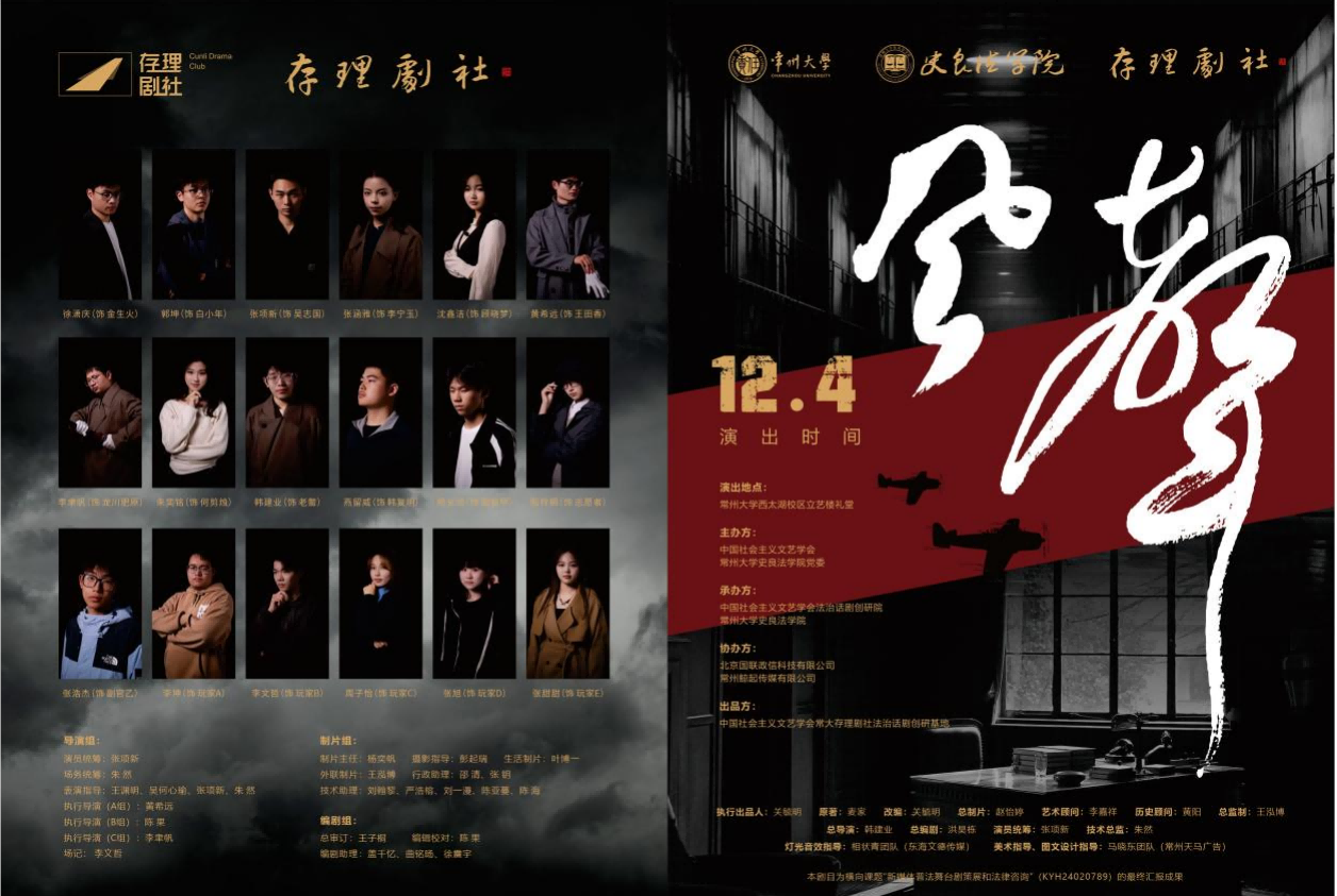 為紀(jì)念中國人民抗日戰(zhàn)爭暨世界反法西斯戰(zhàn)爭勝利80周年,貫徹落實《中華人民共和國法治宣傳教育法》,12月4日晚,常州大學(xué)史良法學(xué)院存理劇社在西太湖校區(qū)立藝樓大禮堂舉辦法治話劇《風(fēng)聲》公演。活動由常州大學(xué)史良法學(xué)院、中國社會主義文藝學(xué)會法治話劇創(chuàng)研院主辦,中國社會主義文藝學(xué)會常大存理劇社法治話劇創(chuàng)研基地承辦,北京國聯(lián)政信科技有限公司協(xié)辦。